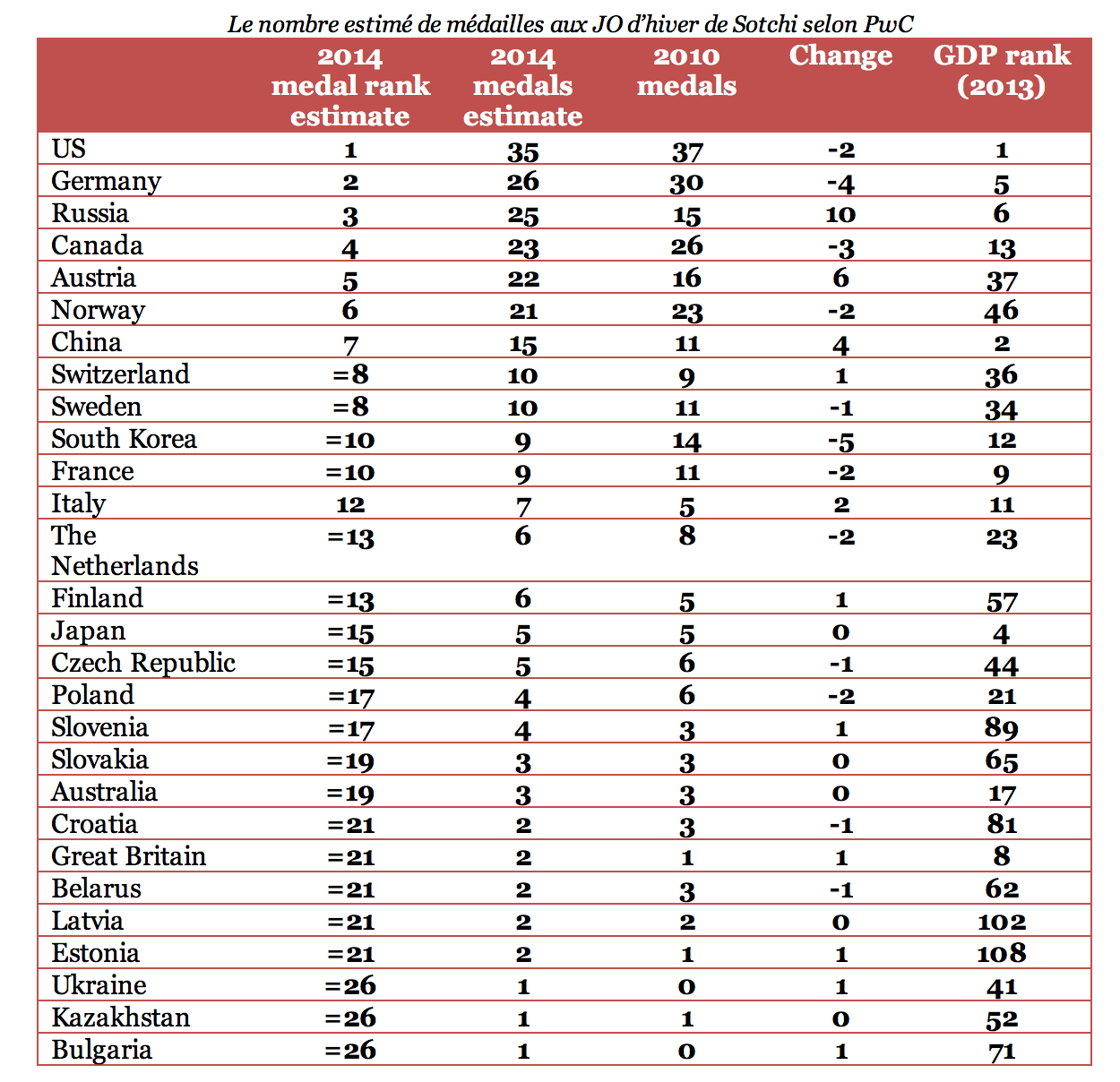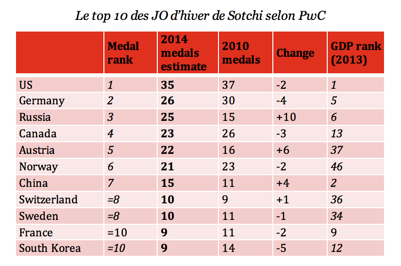 La France, 9ème pays au JO de Sotchi 2014 selon PwC
