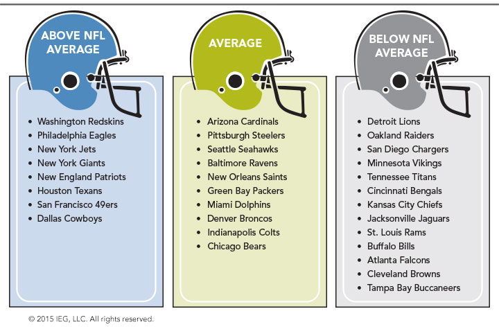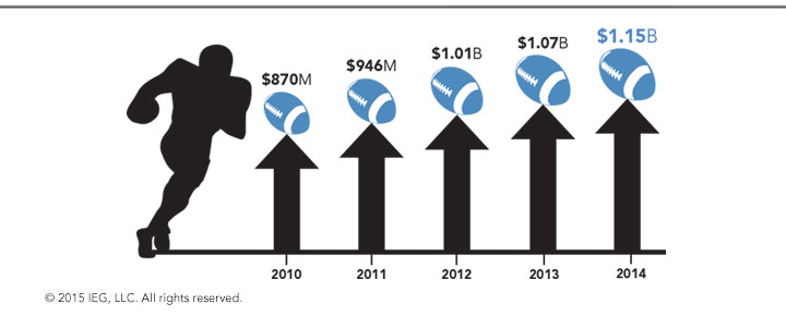 Selon une étude de IEG, la NFL a augmenté ses revenus issus du sponsoring en 2014 pour atteindre 1,15 milliards de dollars (+7,8 % par rapport à 2013).