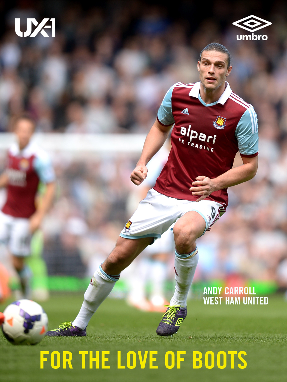 La UX-1 est donc la nouvelle chaussure d’Umbro, qui a fait ses débuts en Premier League à la fin de la saison, portée entre autre par Andy Caroll et qui sera à la Coupe du Monde puisqu’elle est portée par Joe Hart, le gardien des 3 Lions, l’équipe nationale d’Angleterre menée par Wayne Rooney. Joe Hart, qui évolue à Manchester City, récemment couronné du titre de Champion de la Premier League, a déclaré : « J’ai porté la UX-1 durant les derniers matchs de la saison et les sensations furent parfaites. La couleur marque les esprits et j’adore ça ! (…) Ces premiers matchs m’ont donné confiance et m’ont rassuré et j’ai maintenant hâte de la porter au Brésil. »