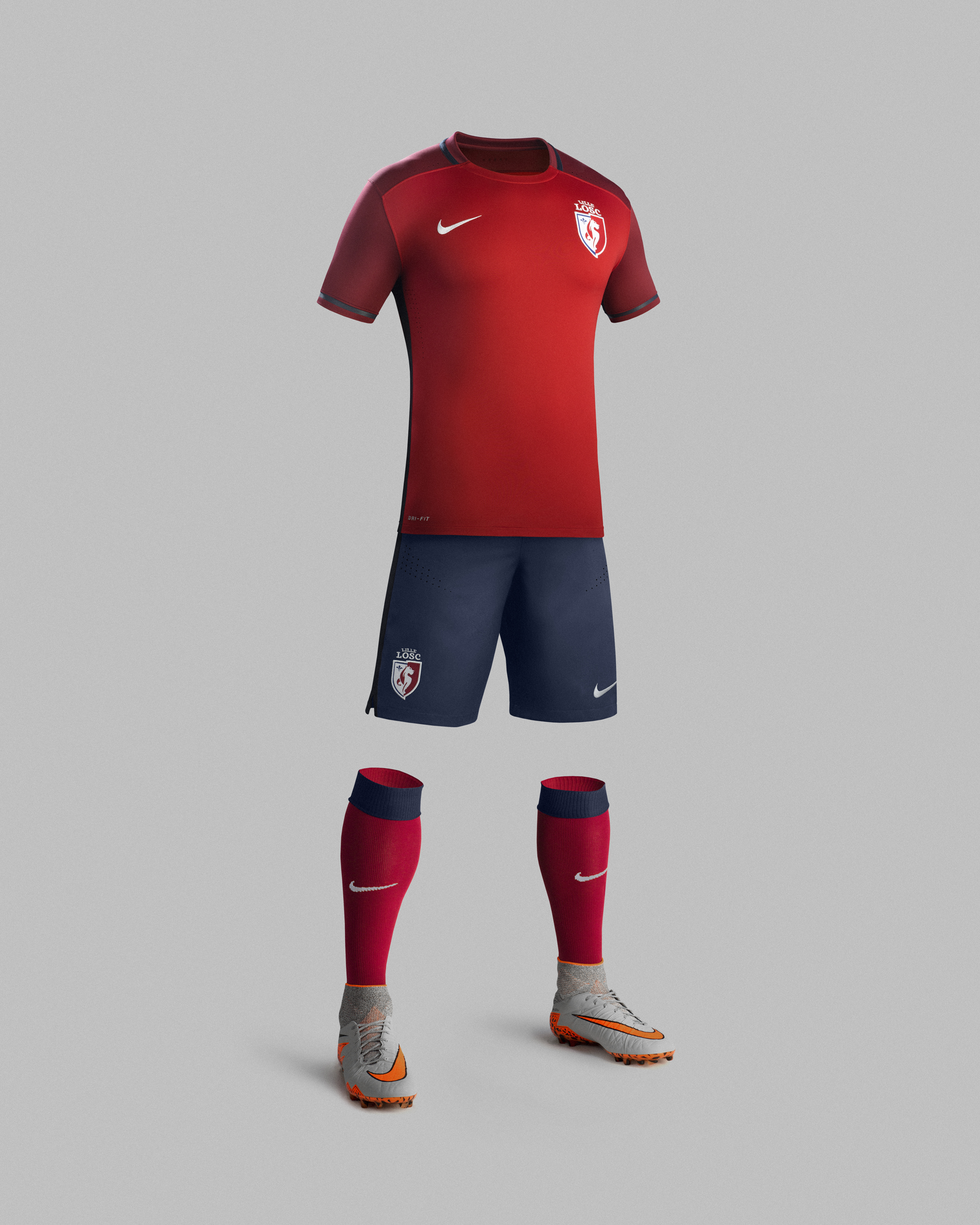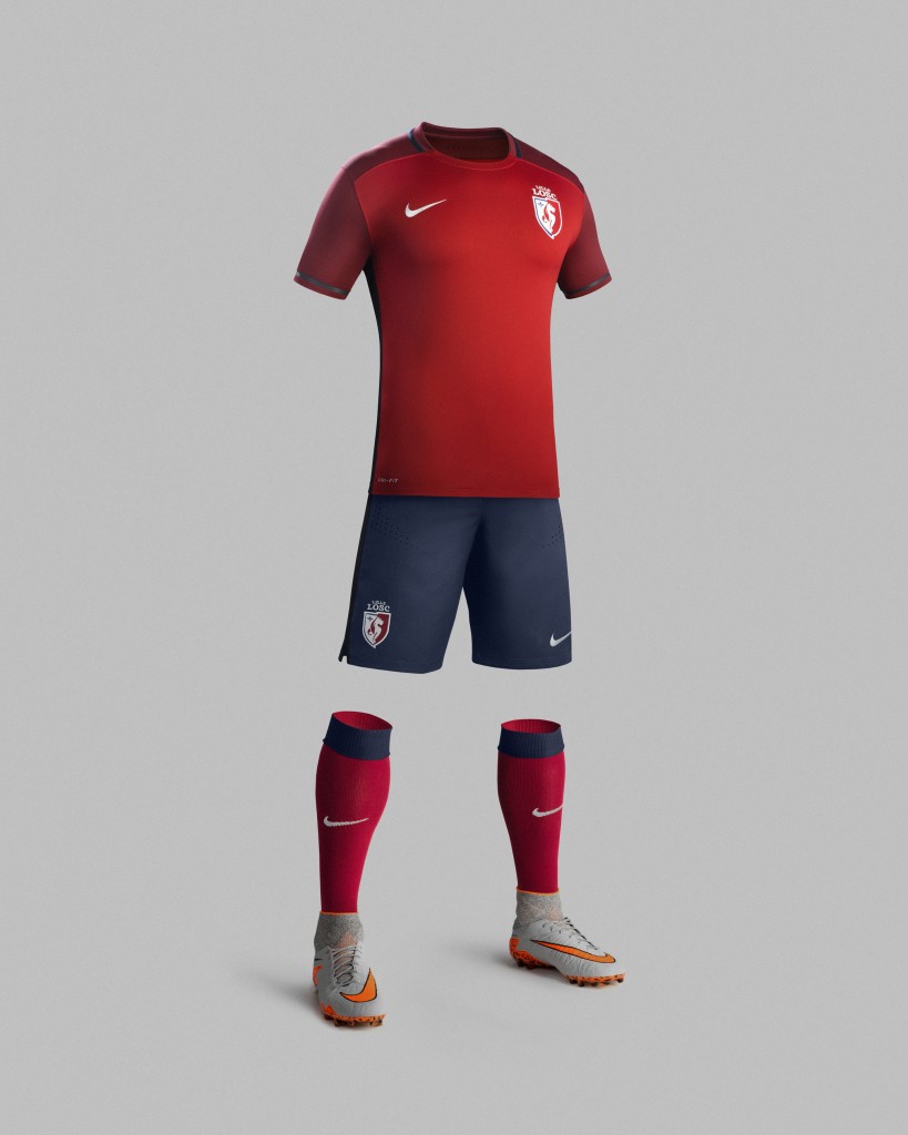 Pour Lille, le nouveau maillot n’est sans rappeler celui de la Roma ou du Paris Saint-Germain avec ses deux tons de rouge. La couleur rouge traditionnelle du club lillois est présente sur la partie supérieure du nouveau maillot alors qu’une forte nuance plus foncée apparaît sur les épaules et sur les manches. La grande nouveauté est au final l’absence de sponsor maillot sur les visuels présentés par Nike Football. En effet, Etixx, sponsor maillot lors de la saison 2014-15 n’apparait plus alors qu’on sait que Godin, leader européen des produits de chauffage au bois et de cuisson, deviendra partenaire du LOSC pour la saison 2015-16 et s’affichera sur la manche du maillot des Dogues et que Vacansoleil a encore une année de contrat et de visibilité au dos du maillot.