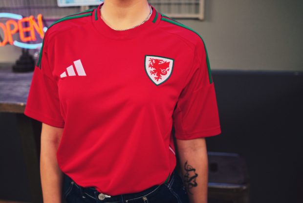 Le rouge du dragon gallois vient enflammer le maillot domicile de son équipe. De minces bandes de vert, de jaune et de rouge, dont la forme s’inspire de la queue du dragon, sinuent sur les flancs du maillot. Le maillot extérieur s’inspire du célèbre chapeau des supporters gallois et reprend des motifs rétro et les couleurs du drapeau sur un fond de jaune pâle. Le slogan affiché à l’arrière du col des deux maillots, « Team Play, is the Best Play » (« Jouer en équipe est la meilleure manière de jouer »).