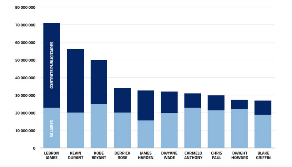 En terme de revenus générés sur une saison, LeBron James fait toujours la loi avec des gains estimés à 71 millions $ (23 millions de salaire avec Cleveland et 48 millions de recettes publicitaires). Ce chiffre ne prend pas en compte son nouveau contrat à vie signé avec Nike fin 2015 qui le fera à coup sûr fortement augmenter ses recettes issus du sponsoring.