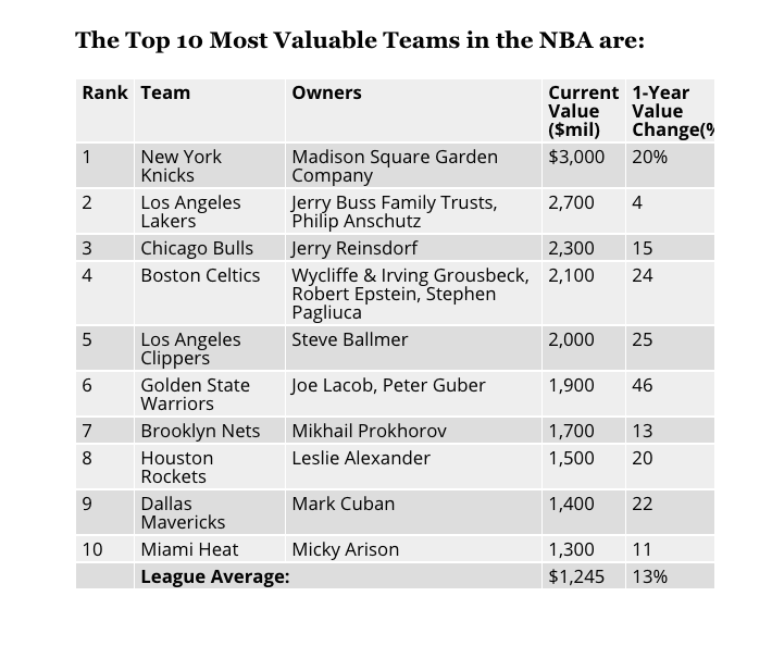 Les New York Knicks, valent désormais 3 milliards $ et dépassent la valorisation des Lakers (2,7 milliards) selon Forbes. New Orleans ferme la marche avec une valorisation de 650 millions $, la plus faible des 30 équipes NBA. Les Bulls (2,3 milliards) sont devant les Celtics de Boston qui occupent malgré tout une belle quatrième place (2,1 milliards $) pour une équipe issue d’un plus petit marché.
