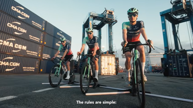 Au cœur du dispositif, le Container Challenge matérialise cette rencontre entre sport et industrie. Deux équipes de trois coureurs s’affrontent dans un défi de puissance : produire un maximum de watts pour faire “décoller” leur conteneur. Pensé dans un environnement portuaire en activité et soumis à de fortes contraintes de temps et de sécurité, le concept mise sur la simplicité et l’efficacité pour créer un contenu immédiatement compréhensible et impactant.