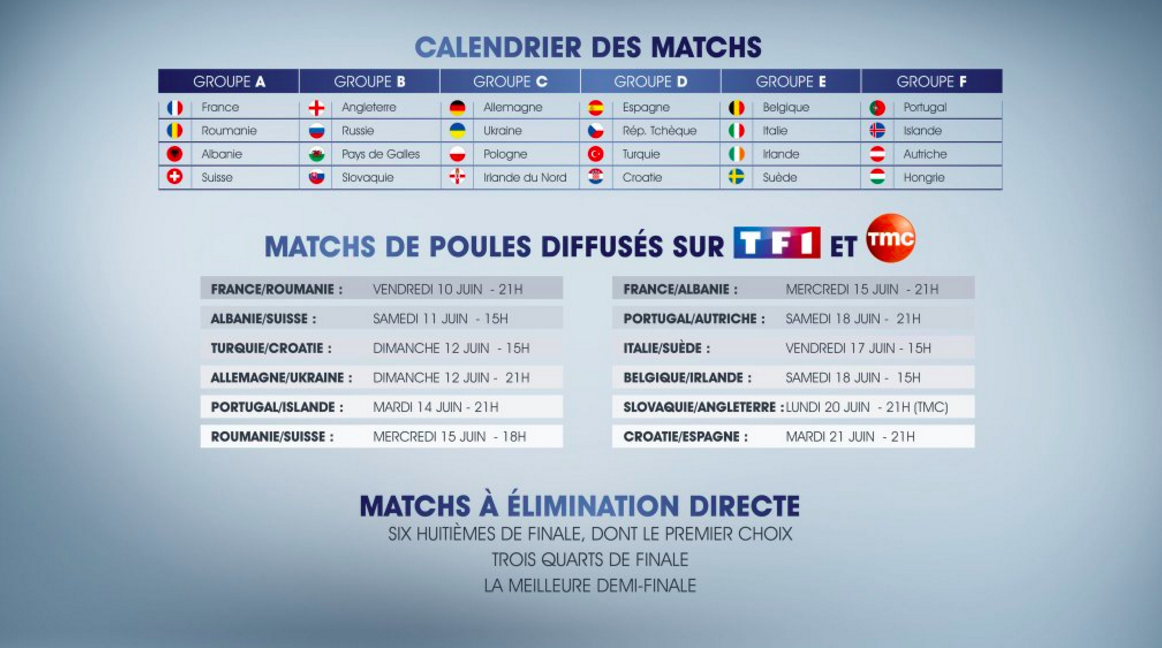 TF1 retransmettra 21 rencontres (12 matches de poule, 6 huitièmes de finale, 3 quarts et une demi-finale) et TMC proposera un match en prime time le 20 juin (Slovaquie/ Angleterre). Pour la première fois, cinq matches seront retransmis en ultra HD pour les abonnés d’Orange.