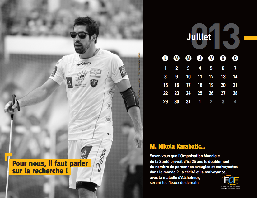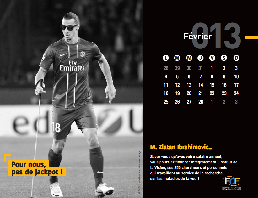 La Fédération des Aveugles de France (FAF) a frappé un nouveau coup avec son calendrier 2013. Habitué des opérations qui font du bruit pour se faire connaitre, la FAF a décidé d’intégrer les 2 personnalités sportives qui ont marqué l’actualité 2012, à savoir Zlatan Ibrahimovic et Nikola Karabatic. Le premier par son arrivée et son salaire astronomique et le deuxième par une sombre affaire de paris qui a secoué le monde du handball français apparaissent donc au mois de février et juillet 2013.