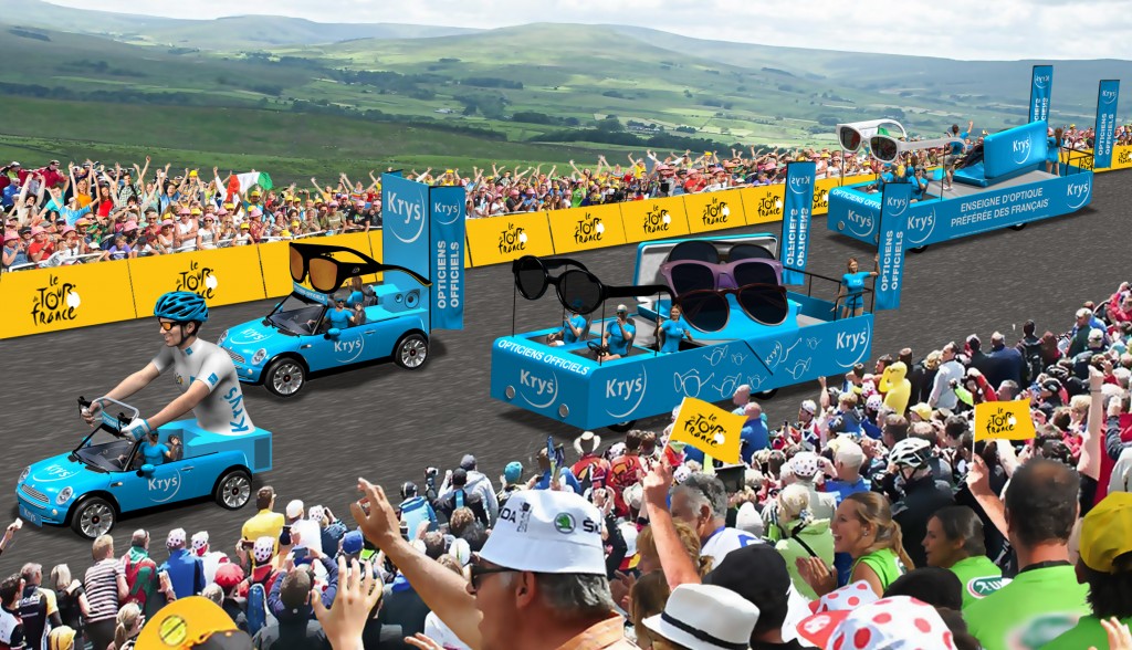 En plus d’un dispositif média et une théâtralisation de ses magasins, Krys ira à la rencontre des Français sur les routes grâce à sa caravane. Elle sera composée de 4 véhicules : une première voiture qui représente un cycliste avec le Maillot Blanc, une autre voiture et 2 chars. De manière ludique, Krys souhaite sensibiliser le public aux risques du soleil sur les yeux.