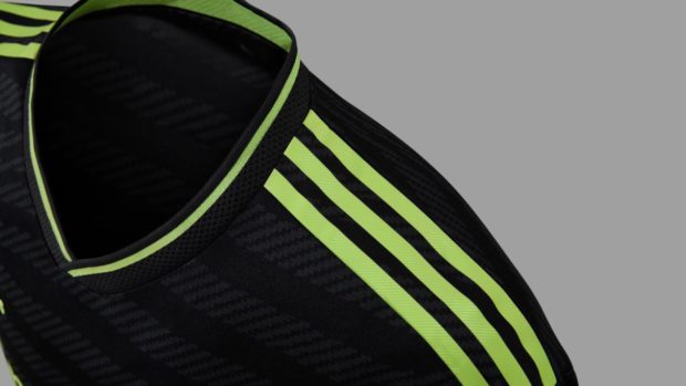 Le design élégant et futuriste du maillot propose une couleur de base noire avec des détails métalliques jaune citron audacieux et brillants qui reflètent la vision du nouveau Bernabéu lors d’une soirée européenne, évoquant les lumières du stade qui font briller la ville. Un motif subtil conçu dans le maillot rend hommage au design moderne de la couverture du toit en acier du stade, tandis qu’une nouvelle coupe en V complète le look pointu du kit, faisant également un clin d’œil aux nombreuses victoires du Real Madrid en Coupe d’Europe.