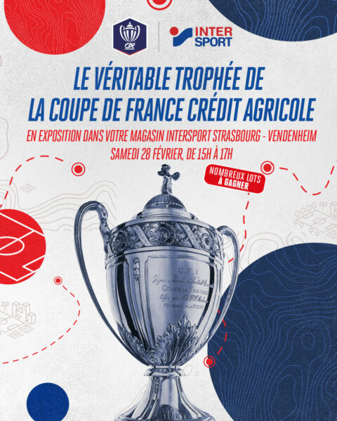 Dans le cadre de la “Tournée du Trophée” organisée par Intersport et ouverte au public, le magasin Intersport Strasbourg – Vendenheim accueillera ce trophée emblématique du football français. Après des étapes à Fontenay-le-Comte (32es de finale), Bayeux (16es de finale) et Laval (8es de finale), c’est désormais l’Alsace qui vibrera au rythme de la Coupe de France.
