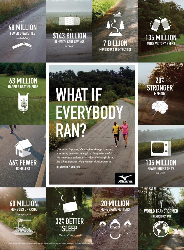 Cette campagne de Mizuno, « What if Everybody Ran » est basée sur une étude menée à l’Université de Caroline du Nord qui a cherché à mettre en parallèle, les coûts, économies et chiffres marquants si toute la population des Etats-Unis se mettait à travailler. Les visuels ci-dessous, disponible sur le compte Pinterest de Mizuno, vous donne une idée de ce que le running peu apporter d’un point de vue économique et social.