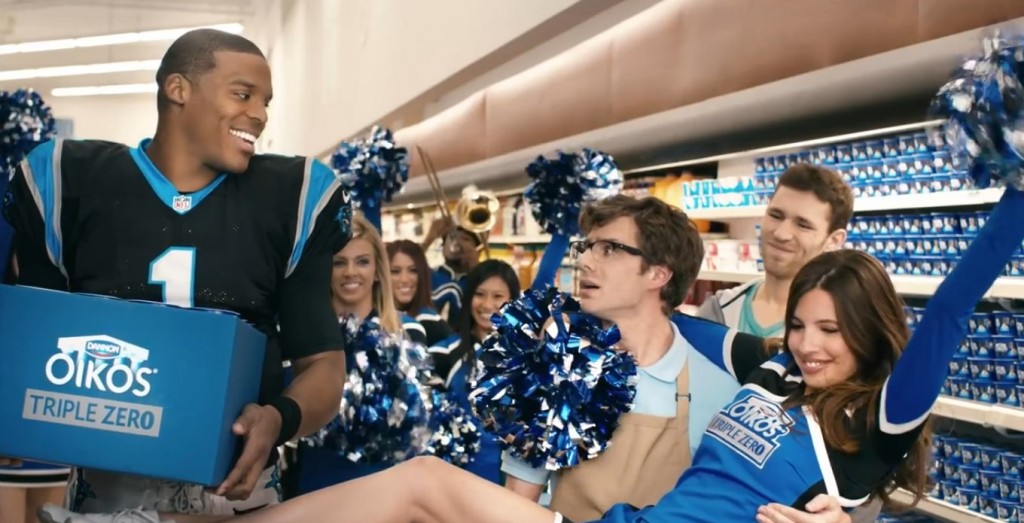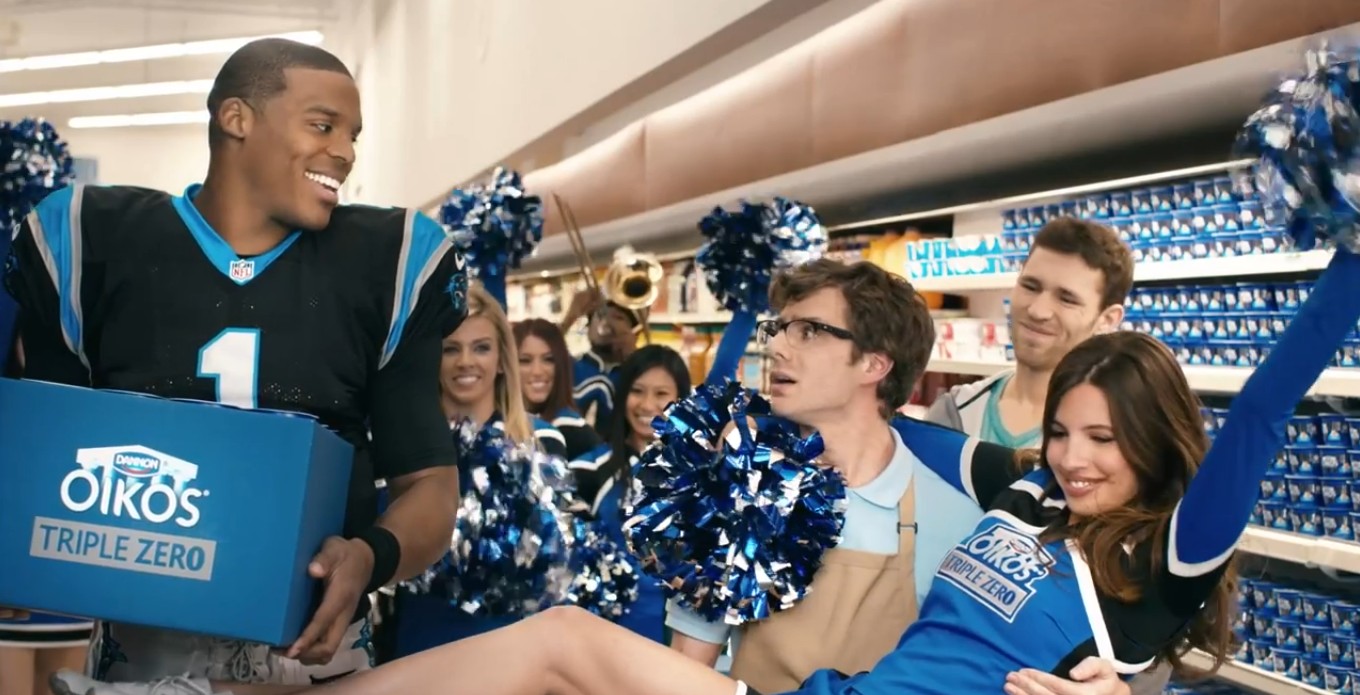 Le joueur des Carolina Panthers, Cam Newton prête son image dans cette publicité humoristique qui vante les bienfaits du yaourt grecque riche en protéines Oikos Triple Zero de Dannon.