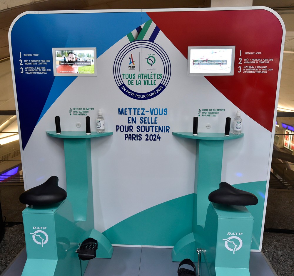 Pour lancer sa campagne de soutien à la candidature Paris 2024 « Tous athlètes de la ville », la RATP invite les 12 millions de voyageurs quotidiens à pédaler dans un certain nombre de stations de métro et RER. Des vélos et vélos à bras sont mis à disposition. Un décompte des kilomètres virtuels parcouru est fait dans chaque lieu où est déployé le dispositif, une preuve de l’engagement des parisiens pour soutenir la candidature de Paris 2024.