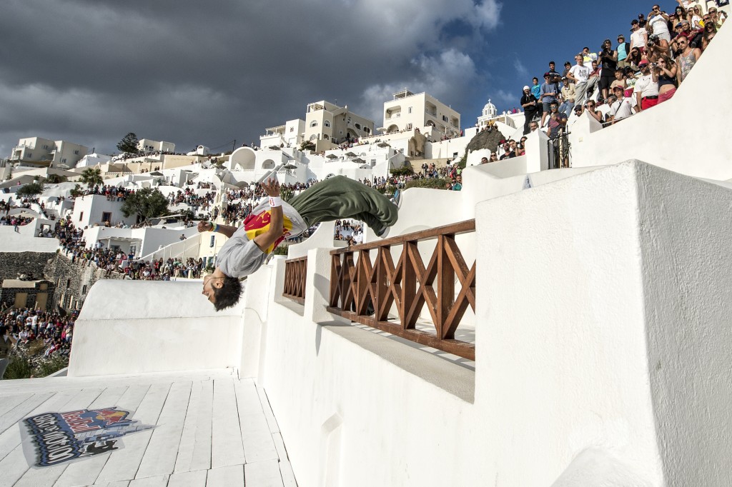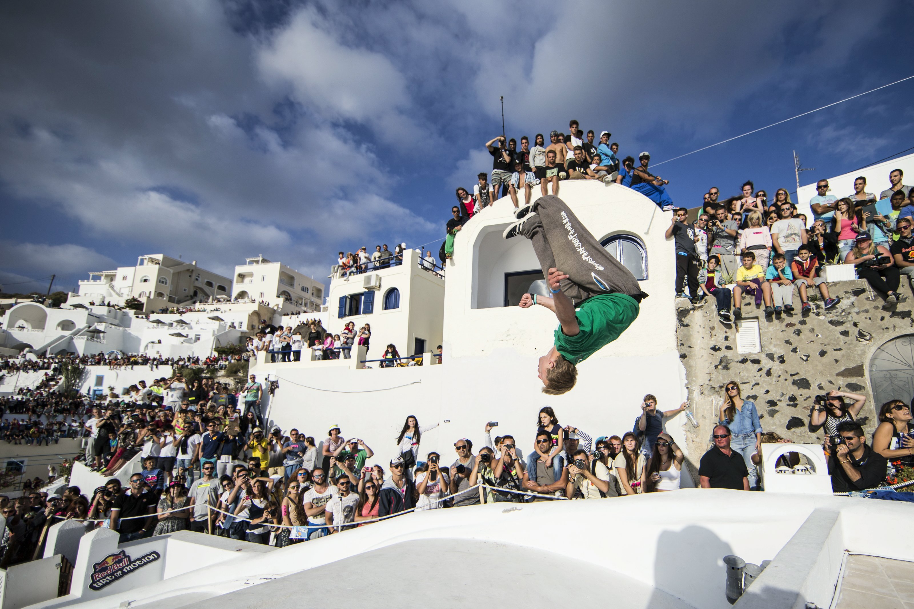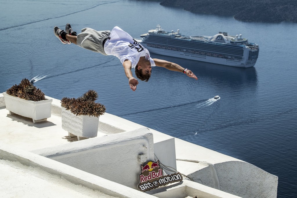Le Red Bull Art of Motion est un concours de parkour qui a eu lieu le 4 octobre dernier dans un décor idéal, paradis des freerunners : Santorin. Lieu adapté à la pratique accueille la compétition pour la 4ème année consécutive. Cette ile grecque volcanique offre de nombreux obstacles de par l’architecture de ses bâtiments et l’organisation de la ville de Fira. Les toits, terrasses et autres piscines de la ville forment le terrain de jeu de la compétition, les éléments avec lesquels les sportifs doivent s’exprimer. Le Red Bull Art of Motion est le plus gros événement parkour de la saison et se différencie de par l’originalité du décor et de l’architecture urbaine.