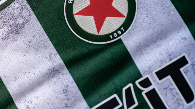 Le maillot « béton rayé » réinterprète les rayures vertes et blanches historiques du club avec un motif inédit créé à partir d’un fragment réel de béton issu de l’ancienne tribune Ouest du stade Bauer. Un hommage concret à l’histoire du club.